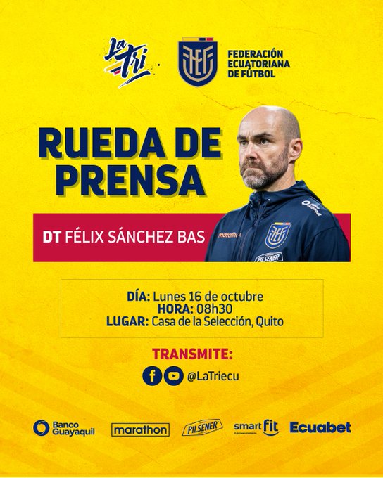 InicioFutbol Futbol Félix Sanchez Bas Director Técnico de la TRI brindara una rueda de prensa previo al partido de mañana frente a Colombia By Carlos Vasquez 16 October, 2023 0 318 FacebookTwitterWhatsApp Cuota FacebookTwitterWhatsApp Artículo anteriorDaniel Noboa Azín con 35 años, se convertirá en el presidente más joven en la historia de Ecuador. Este 30 de noviembre cumplirá 36 años, edad con la que asumirá el poderArtículo siguienteEsta es la Fecha 4 de las eliminatorias mundialistas sudamericanas, donde jugamos de local frente a Colombia Carlos Vasquez Related Articles Futbol Están lista las nuevas camisetas de Emelec 2026 las muestras el bombillo en sus redes sociales en el mes de su aniversario Noticias La Asamblea Nacional de Ecuador rechazó autorizar el enjuiciamiento penal de la asambleísta Diana Jácome al no alcanzar los votos necesarios, mientras que el... Noticias Mercedes Caicedo Aldaz fue designada el 24 de abril de 2026 como la nueva presidenta del Consejo de la Judicatura (CJ) de Ecuador por... Mantente Conectado465FansMe gusta1,205SeguidoresSeguir - Advertisement - Latest Articles Futbol Están lista las nuevas camisetas de Emelec 2026 las muestras el bombillo en sus redes sociales en el mes de su aniversario Noticias La Asamblea Nacional de Ecuador rechazó autorizar el enjuiciamiento penal de la asambleísta Diana Jácome al no alcanzar los votos necesarios, mientras que el... Noticias Mercedes Caicedo Aldaz fue designada el 24 de abril de 2026 como la nueva presidenta del Consejo de la Judicatura (CJ) de Ecuador por... Futbol Liga Deportiva Universitaria cerró su semana de trabajos este viernes, dejando lista la formación titular que visitará al Club Sport Emelec, este sábado desde... General Barcelona SC y su entrenador César Farías fueron sancionados por la Conmebol con un total de USD 60.000 en multas tras incidentes en la... Cargar más