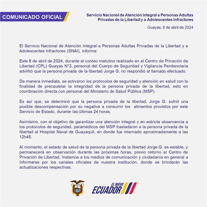 InicioNoticias Noticias El SNAI informa que el ex vicepresidente Jorge Glas sufrió una descompensación por su negativa a comer en las últimas 24 horas. Fue trasladado al hospital Naval y se encuentra estable. By Carlos Vasquez 9 April, 2024 0 266 FacebookTwitterWhatsApp Cuota FacebookTwitterWhatsApp Artículo anteriorDe acuerdo a Liga de Quito Óscar Zambrano volvería a jugar, pues no ha sido sancionado A esta resolución se llegó tras la audiencia preliminar llevada a cabo en Conmebol.Artículo siguienteEl ex candidato del correísmo Carlos Rabascall aspira que la crisis diplomática no traiga consecuencias para los ecuatorianos. Carlos Vasquez Related Articles General Niels Olsen, presidente de la Asamblea Nacional de Ecuador, pronunció estas palabras Afirmó que la labor legislativa se ha consolidado como un referente de... Noticias El ministro del Interior, John Reimberg, confirmó que aproximadamente 600 drones han sido utilizados por grupos de delincuencia organizada para intentar vulnerar la seguridad... Noticias La bancada oficialista se encuentra definiendo internamente quién asumirá el liderazgo del proceso tras los recientes hallazgos de presunta corrupción y los operativos ejecutados... Mantente Conectado465FansMe gusta1,205SeguidoresSeguir - Advertisement - Latest Articles General Niels Olsen, presidente de la Asamblea Nacional de Ecuador, pronunció estas palabras Afirmó que la labor legislativa se ha consolidado como un referente de... Noticias El ministro del Interior, John Reimberg, confirmó que aproximadamente 600 drones han sido utilizados por grupos de delincuencia organizada para intentar vulnerar la seguridad... Noticias La bancada oficialista se encuentra definiendo internamente quién asumirá el liderazgo del proceso tras los recientes hallazgos de presunta corrupción y los operativos ejecutados... Futbol U.Catolica de Chile derroto 2 a 1 a Barcelona en el marco de Copa Libertadores grupo D los toreros están con 0 puntos y... General Mercedes Caicedo Aldaz fue posesionada el 29 de abril de 2026 como la nueva presidenta del Consejo de la Judicatura en la Asamblea Nacional de Ecuador. Su designación, realizada... Cargar más