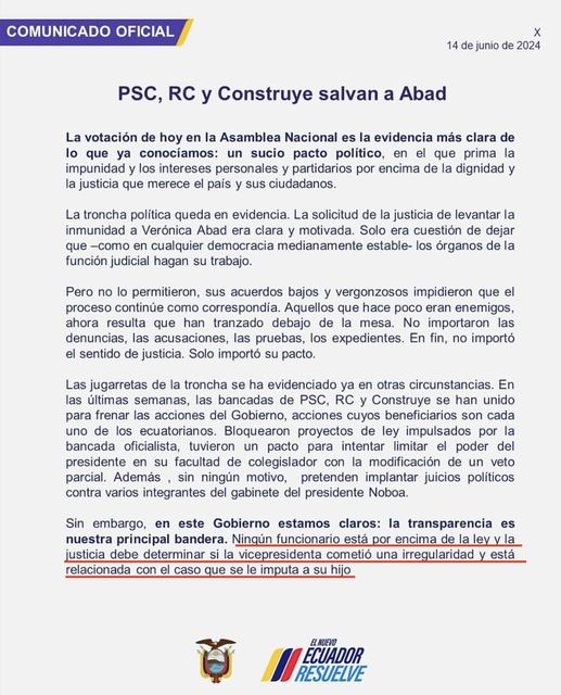 InicioNoticias Noticias El Gobierno Nacional emitió un comunicado oficial relacionado por lo resuelto por la Asamblea en el caso Verónica Abad y denuncio un sucio pacto político entre el PSC-RC y CONSTRUYE By Carlos Vasquez 15 June, 2024 0 300 FacebookTwitterWhatsApp Cuota FacebookTwitterWhatsApp Artículo anteriorUn total de 7 jueces de la provincia del Guayas, un fiscal de Delincuencia Organizada Transnacional y un secretario de una Unidad Judicial fueron destituidos hoy por el Consejo de la Judicatura.Artículo siguienteLa Asamblea Nacional niega autorización para inicio de juicio en contra de Verónica Abad segunda mandataria del país 75 votos a favor 30 en contra y 20 abstenciones Carlos Vasquez Related Articles General Niels Olsen, presidente de la Asamblea Nacional de Ecuador, pronunció estas palabras Afirmó que la labor legislativa se ha consolidado como un referente de... Noticias El ministro del Interior, John Reimberg, confirmó que aproximadamente 600 drones han sido utilizados por grupos de delincuencia organizada para intentar vulnerar la seguridad... Noticias La bancada oficialista se encuentra definiendo internamente quién asumirá el liderazgo del proceso tras los recientes hallazgos de presunta corrupción y los operativos ejecutados... Mantente Conectado465FansMe gusta1,205SeguidoresSeguir - Advertisement - Latest Articles General Niels Olsen, presidente de la Asamblea Nacional de Ecuador, pronunció estas palabras Afirmó que la labor legislativa se ha consolidado como un referente de... Noticias El ministro del Interior, John Reimberg, confirmó que aproximadamente 600 drones han sido utilizados por grupos de delincuencia organizada para intentar vulnerar la seguridad... Noticias La bancada oficialista se encuentra definiendo internamente quién asumirá el liderazgo del proceso tras los recientes hallazgos de presunta corrupción y los operativos ejecutados... Futbol U.Catolica de Chile derroto 2 a 1 a Barcelona en el marco de Copa Libertadores grupo D los toreros están con 0 puntos y... General Mercedes Caicedo Aldaz fue posesionada el 29 de abril de 2026 como la nueva presidenta del Consejo de la Judicatura en la Asamblea Nacional de Ecuador. Su designación, realizada... Cargar más