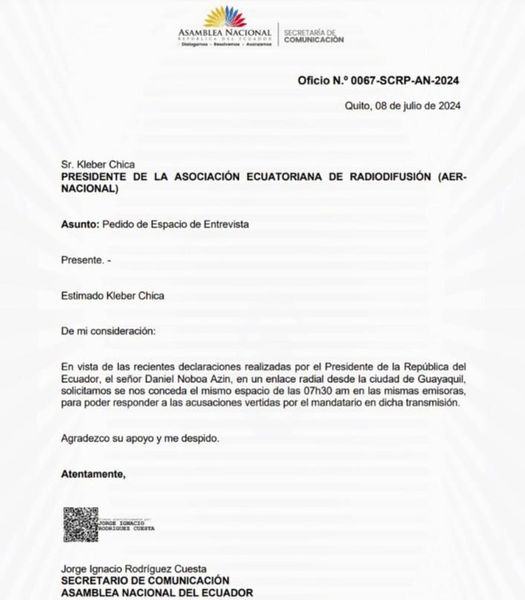InicioNoticias Noticias El presidente de la Asamblea a solicitado su derecho a la replica por lo manifestado por el presidente Noboa el día de ayer para lo cual remitió carta a AER By Carlos Vasquez 9 July, 2024 0 224 FacebookTwitterWhatsApp Cuota FacebookTwitterWhatsApp Artículo anteriorSe efectuó el sorteo de los partidos de la Copa Ecuador que comienzan en su nueva etapa con la participan de los equipos de primera Barcelona jugara con Independiente Jr, Emelec con AV 25Artículo siguienteEl CPCCS en una votación polémica designo a Dunia Martinez como nueva presidenta del Consejo de la Judicatura con el voto dirimente del presidente Andrés Fantoni Carlos Vasquez Related Articles Noticias La Agencia Nacional de Tránsito (ANT) confirmó que, desde el 16 de abril de 2026, se ha extendido la medida que permite a los... Noticias El Banco Central del Ecuador (BCE) ajustó su previsión de crecimiento económico para 2026, situándola en un 2,5 %. Este cambio representa un incremento... Futbol Es oficial que el ciclo de Miller Bolaños en el Club Sport Emelec ha llegado a su fin este 17 de abril de 2026... Mantente Conectado465FansMe gusta1,205SeguidoresSeguir - Advertisement - Latest Articles Noticias La Agencia Nacional de Tránsito (ANT) confirmó que, desde el 16 de abril de 2026, se ha extendido la medida que permite a los... Noticias El Banco Central del Ecuador (BCE) ajustó su previsión de crecimiento económico para 2026, situándola en un 2,5 %. Este cambio representa un incremento... Futbol Es oficial que el ciclo de Miller Bolaños en el Club Sport Emelec ha llegado a su fin este 17 de abril de 2026... Futbol Con doblete del ‘Kitu’ Díaz, Guayaquil City vence a Emelec en el estadio George Capwell por la LigaPro Guayaquil City derrotó 1-3 a Emelec... Noticias El presidente Daniel Noboa aclaró que las medidas arancelarias de su gobierno no responden a influencias externas del ex presidente colombiano Álvaro Uribe. Cargar más